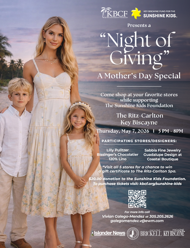 The Key Biscayne Fund for the Sunshine Kids invites you to a "Night of Giving" – A Mother’s Day Special at The Ritz-Carlton Key Biscayne on Thursday, May 7th from 5-8pm.